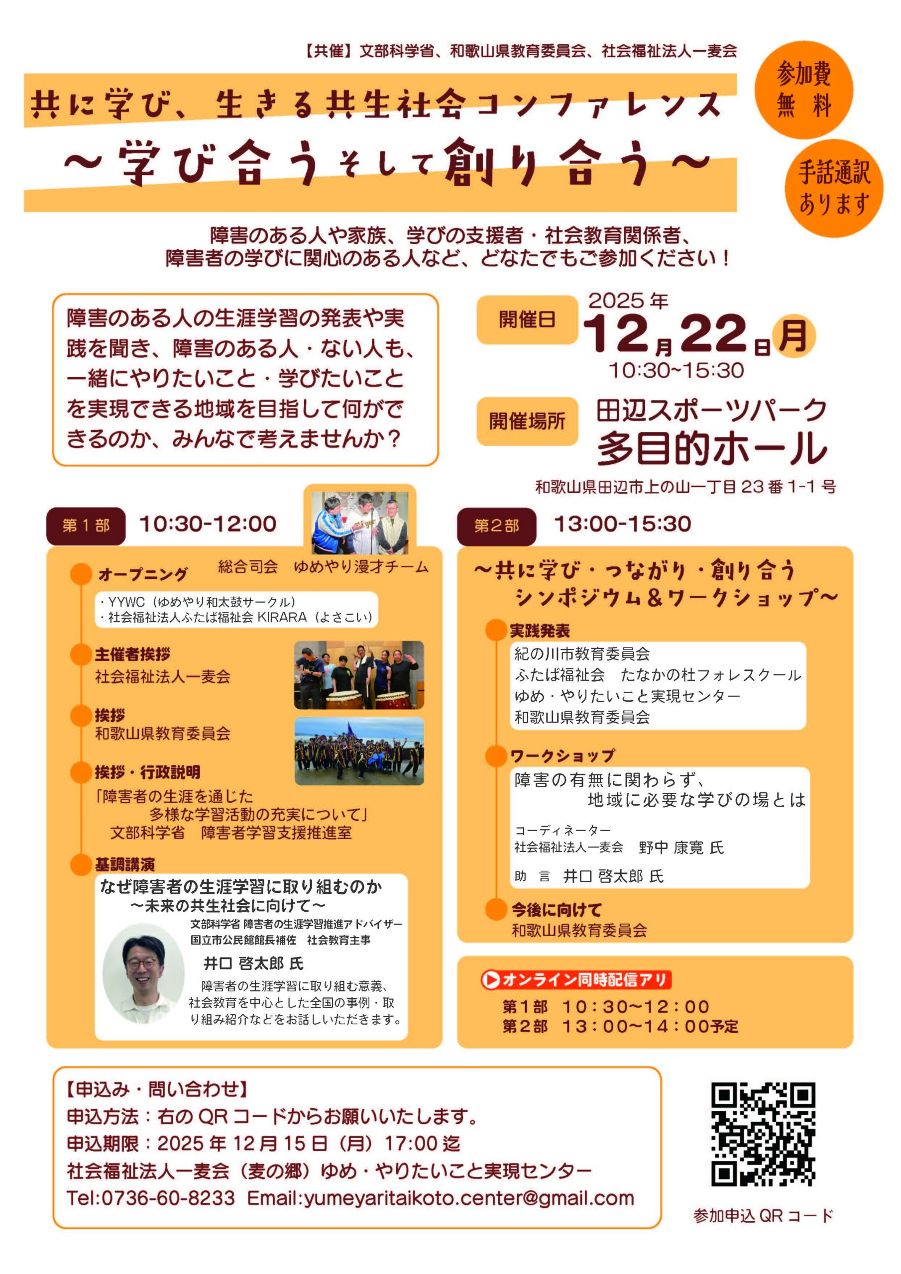 開始日時2025-12-22 10:30開催地田辺市主催【共催】文部科学省 / 和歌山県教育委員会 / 社会福祉法人 一麦会その他福祉・医療青少年・教育 -