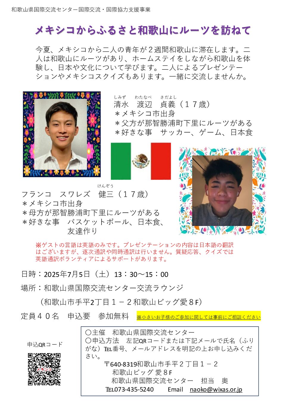 今夏、メキシコから二人の青年が2週間和歌山に滞在します。