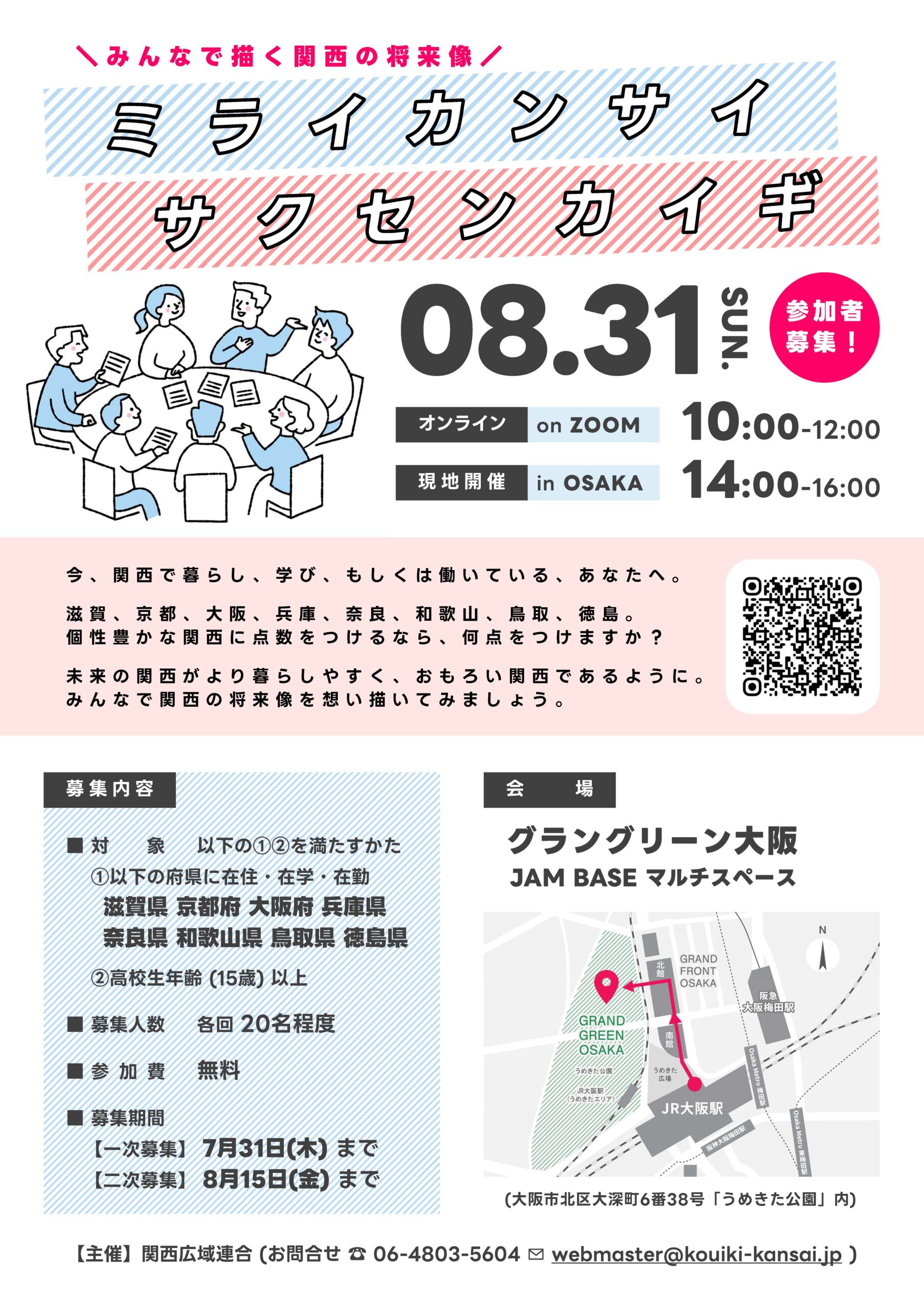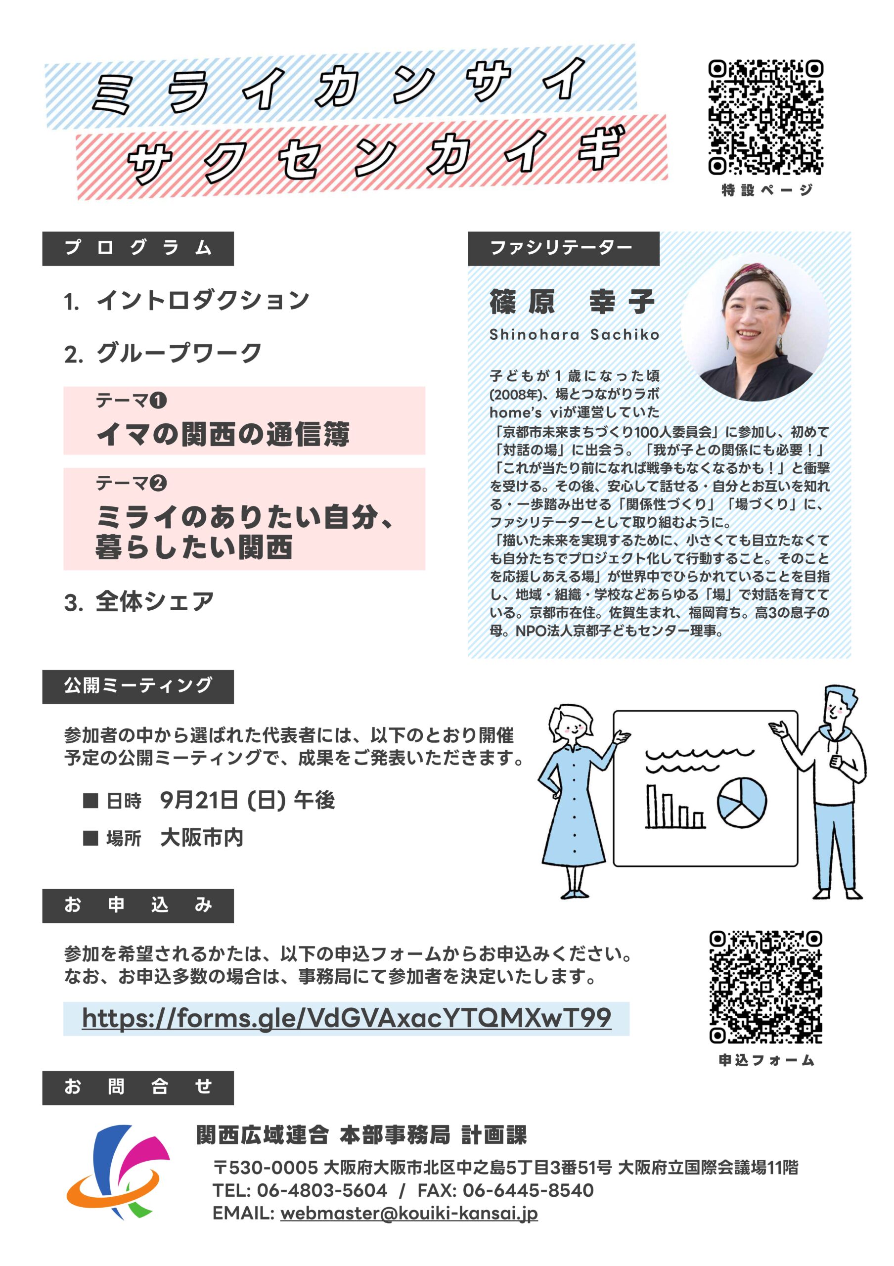 関西広域連合では、関西で暮らし、学び、働いている方々が、関西の現状をどのように感じ、その将来にどのような期待や課題感等を抱いていらっしゃるかを互いに共有し、叶えたい関西の将来像を自由に想い描くワークショップを開催します。