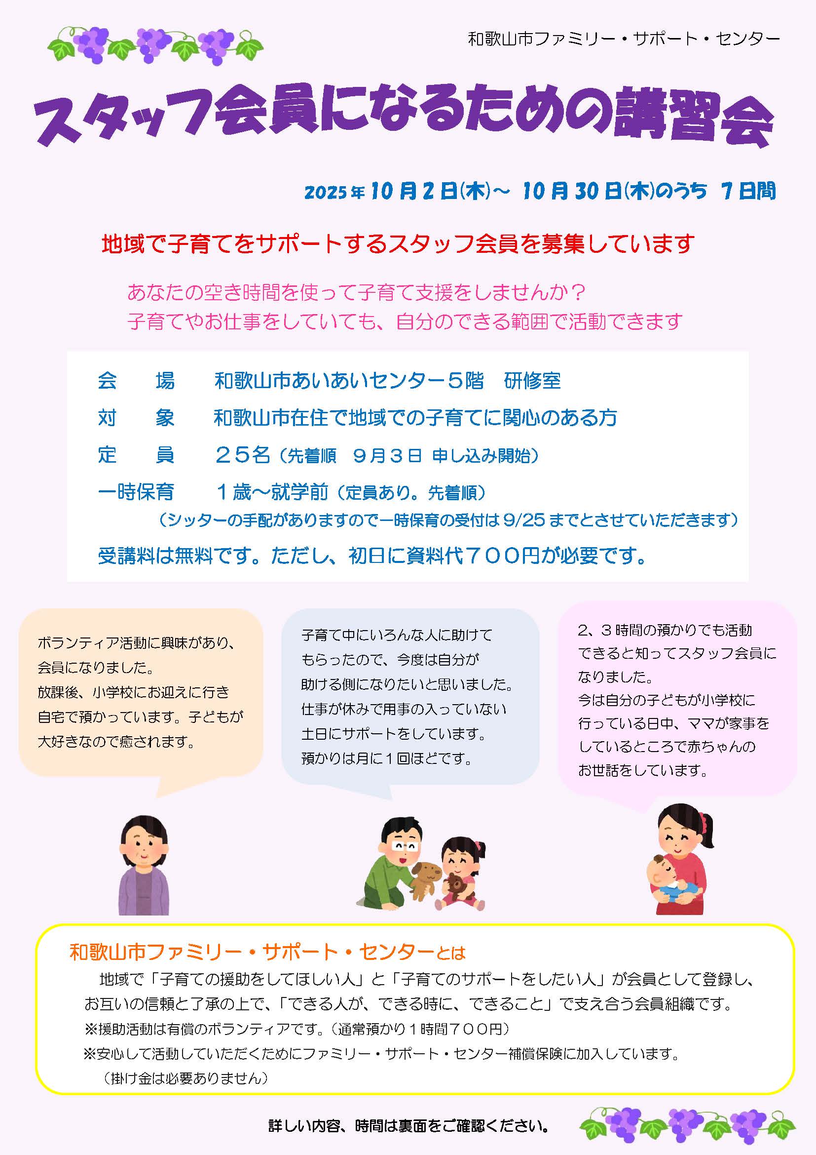 和歌山市ファミリー・サポート・センターは、子育ての援助をしてほしい人(依頼会員)と子育てのサポートをしたい人(スタッフ会員)が会員として登録し、お互いの信頼と了承のもとで支えあう会員組織です。