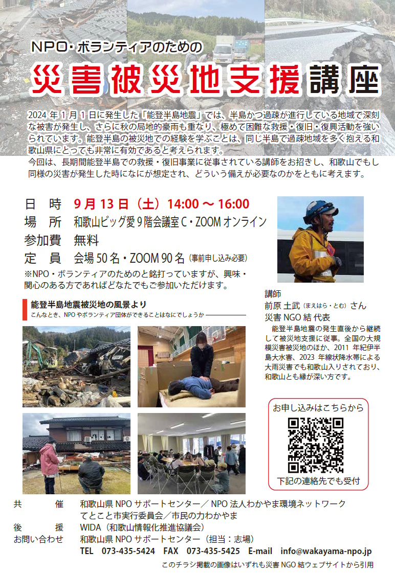 今回は、長期間能登半島での救援・復旧事業に従事されている講師をお招きし、和歌山でもし同様の災害が発生した時になにが想定され、どういう備えが必要なのかをともに考えます。