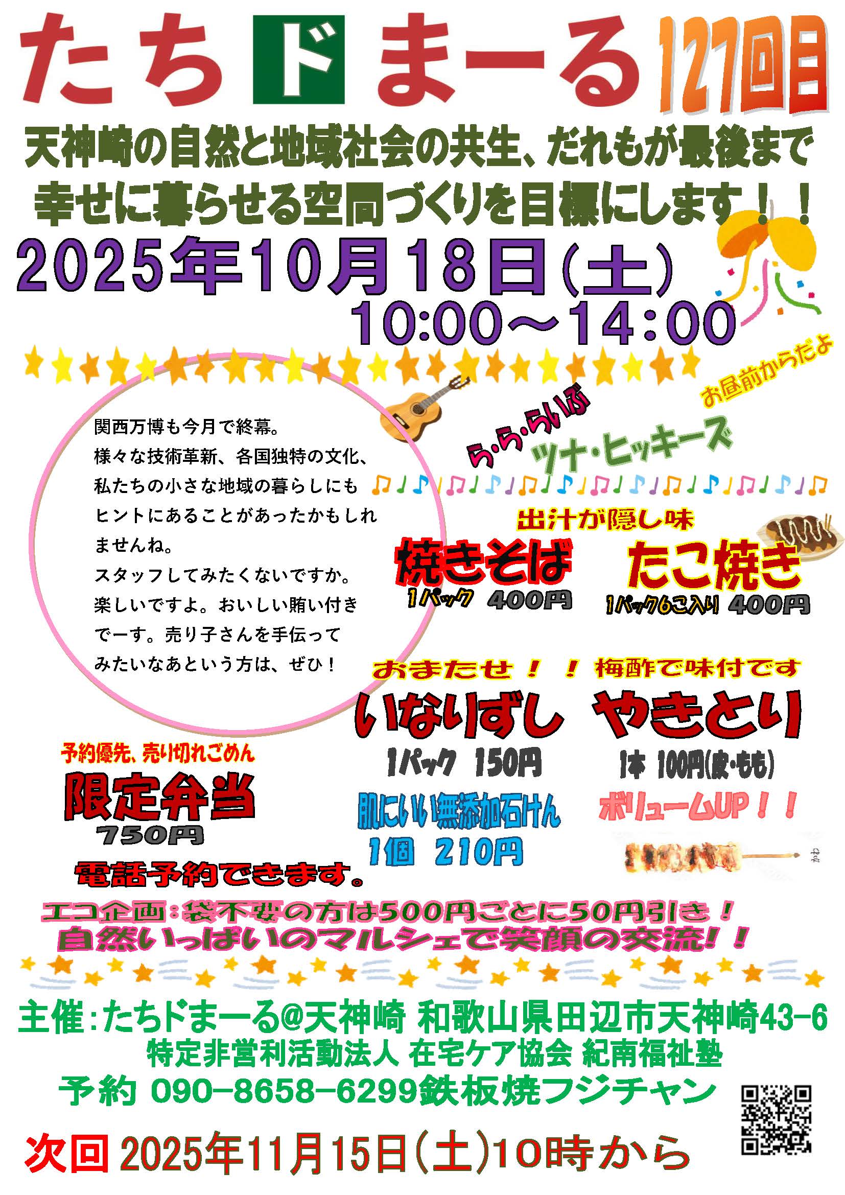 「たちドまーる」は、地域住民の交流を目的に、地元で楽しく続けられるイベントとして始まり、天神崎の自然と地域社会の共生、幸福の増進に寄与する新しい社会事業・活動を模索しています。