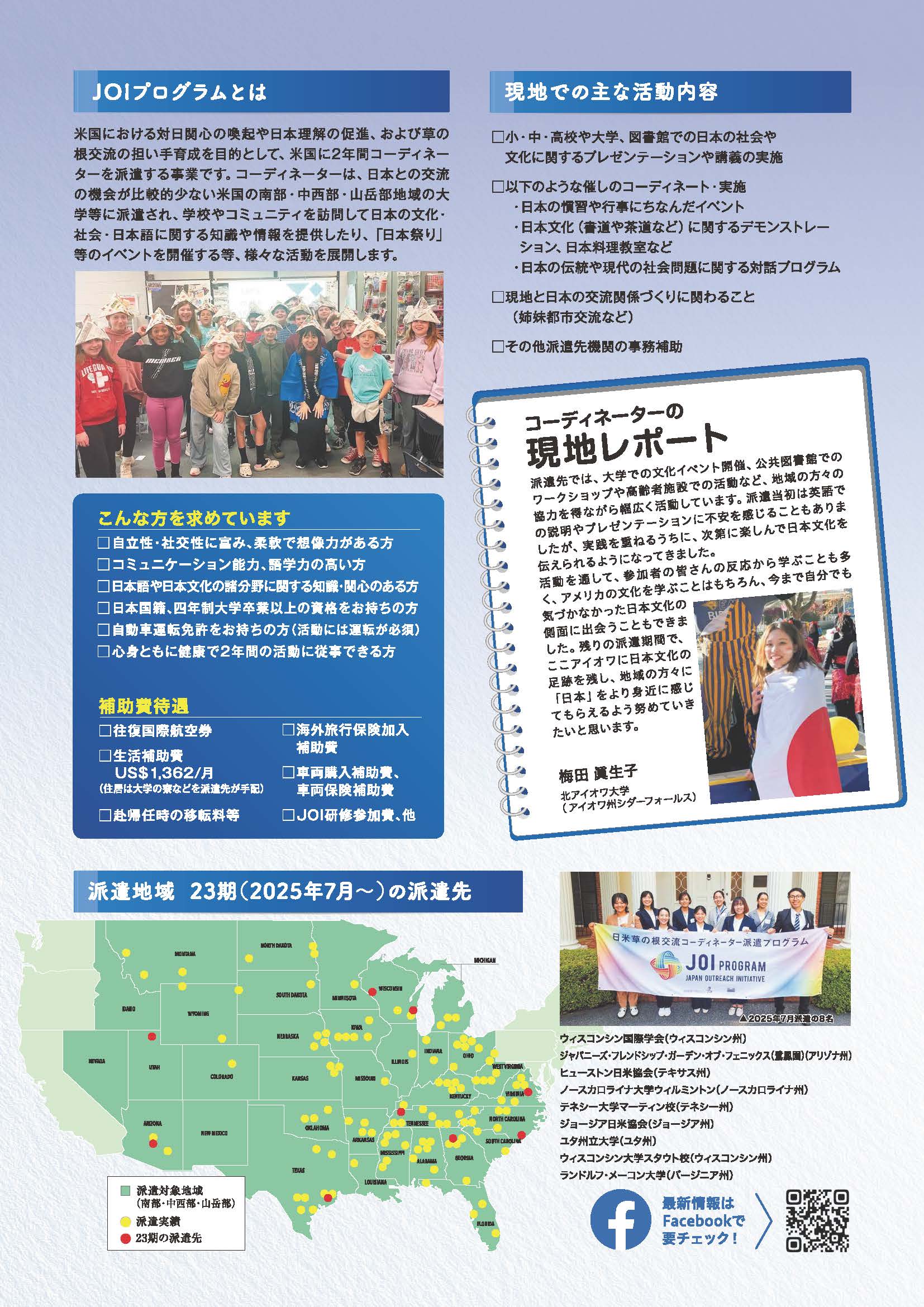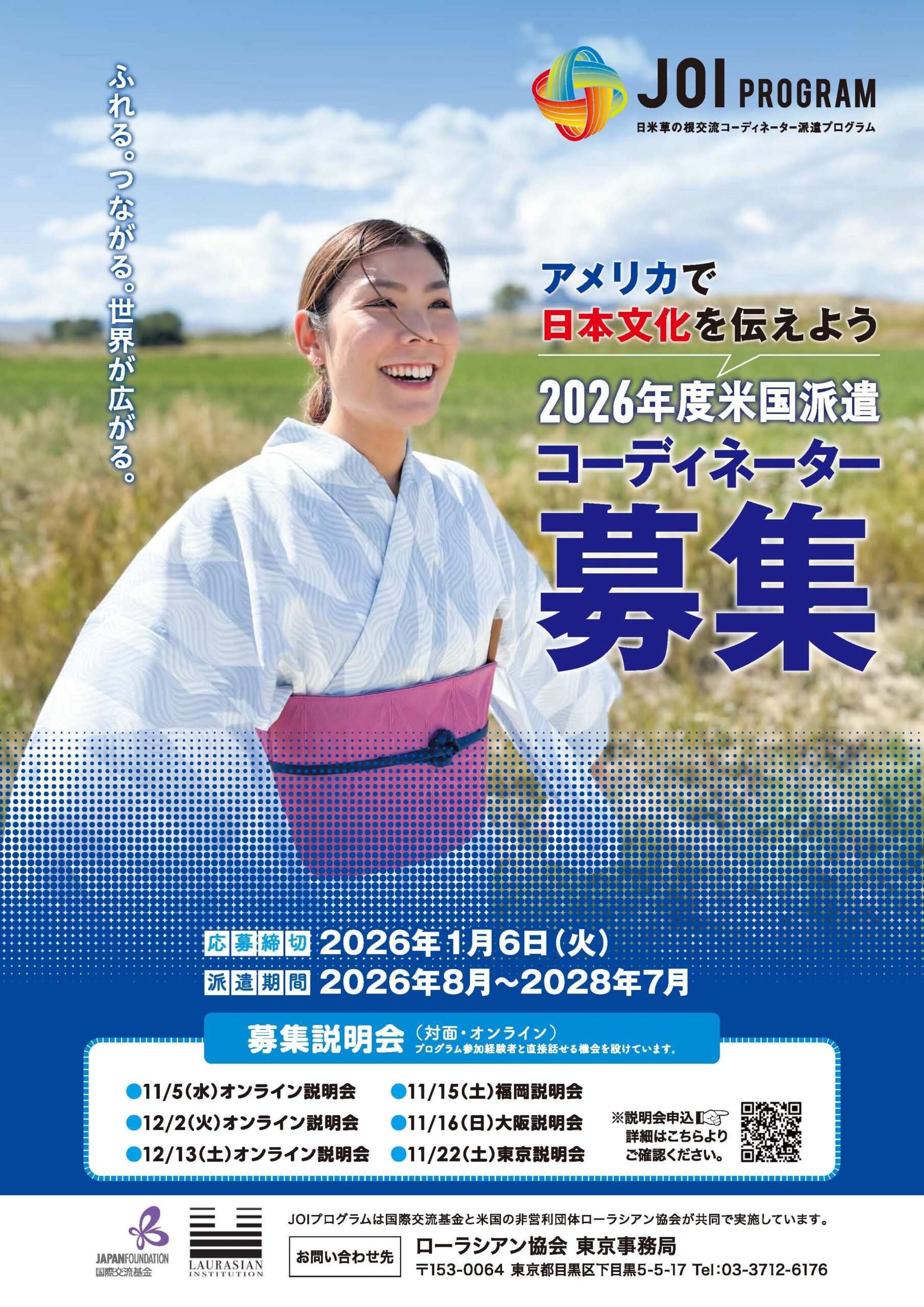 JOIプログラムは、米国の草の根レベルで日本への関心と理解を深めることを目的に、地域に根ざした交流を進めるためのコーディネーターを2年間米国に派遣する事業です。