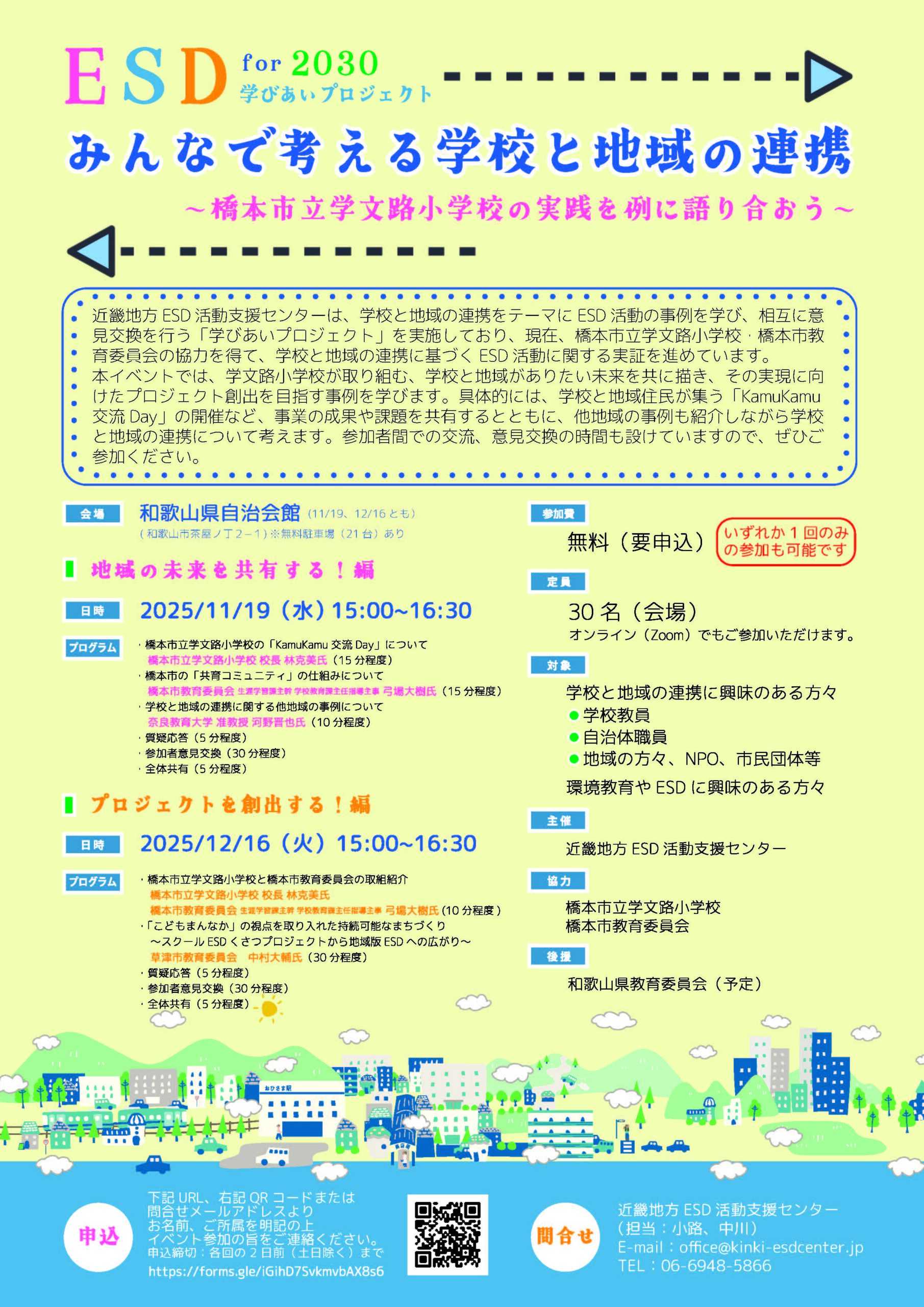 近畿ESDセンターは現在、橋本市立学文路小学校・橋本市教育委員会の協力を得て、学校と地域の連携に基づくESD活動に関する実証を進めています。学校と地域住民が集う「KamuKamu交流Day」の開催など、事業の成果や課題を共有するとともに、他地域の事例も紹介しながら学校と地域の連携について考えます。参加者間での交流、意見交換の時間も設けていますので、ぜひご参加ください。