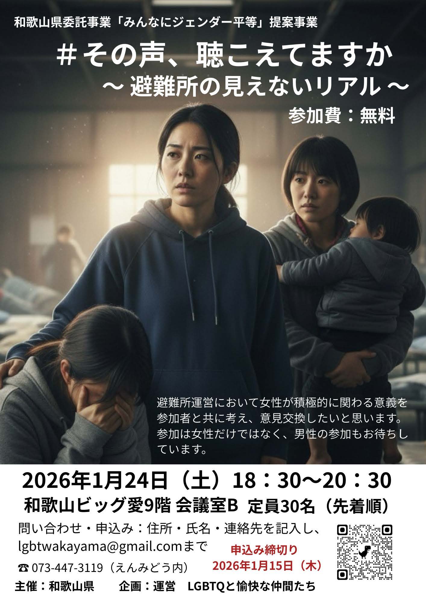 近い将来、大規模な自然災害発生が予測される中、我が国の避難所は、プライバシーや安全性が不十分で、女性やこども、高齢者や要配慮者にとって過ごしにくく、特に避難所運営における女性の関与が少なく、女性目線の配慮が欠けているため、女性が積極的に避難所運営に携わる意義などの共有やグループディスカッションなどを行います。
