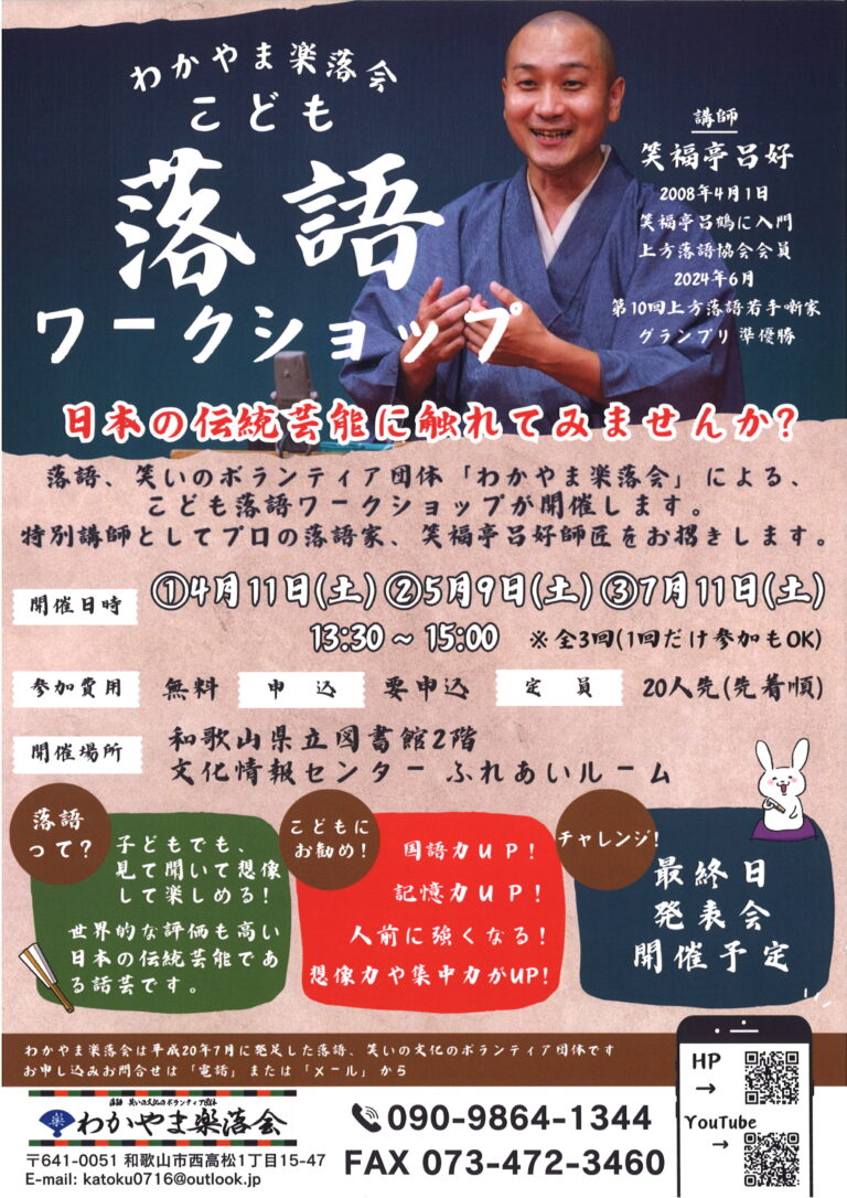 落語、笑いのボランティア団体「わかやま楽落会」による、こども落語ワークショップが開催されます。