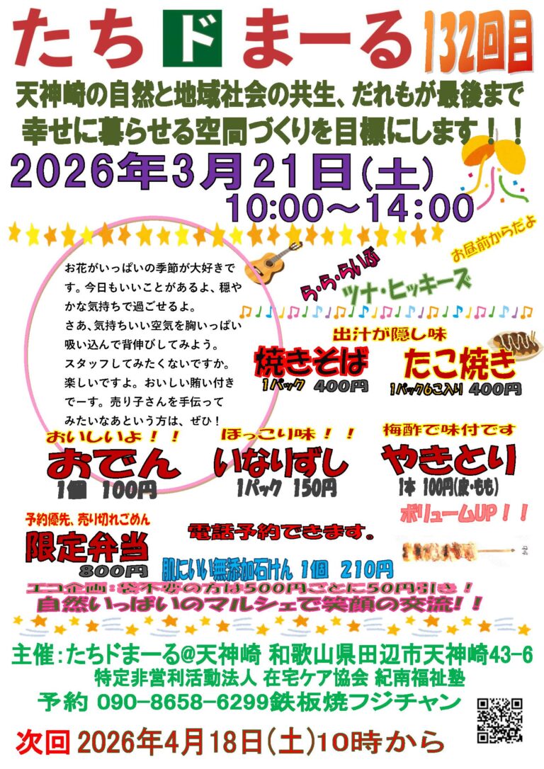 「たちドまーる」は、地域住民の交流を目的に、地元で楽しく続けられるイベントとして始まり、天神崎の自然と地域社会の共生、幸福の増進に寄与する新しい社会事業・活動を模索しています。