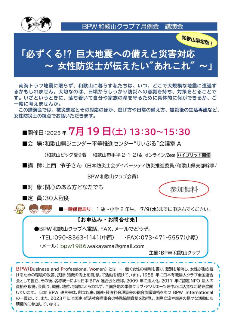 開始日時2025-12-20 14:00開催地オンライン, 和歌山市主催BPW和歌山クラブ男女共同参画 -