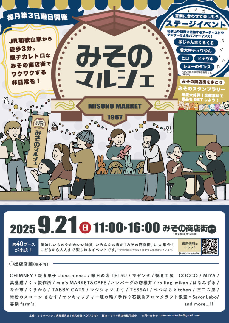 開始日時2025-09-21 11:00開催地和歌山市主催みそのマルシェ実行委員会 (株式会社IKOTAS内)まちづくりイベント終了 -
