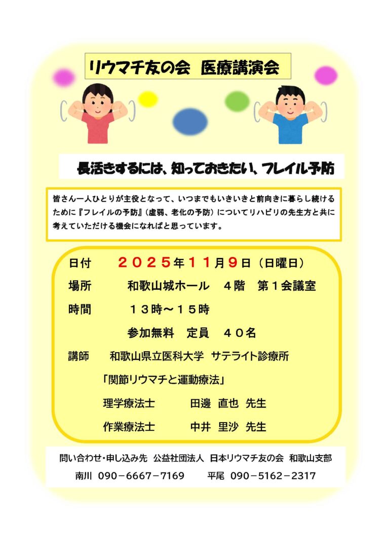 開始日時2025-11-09 13:00開催地和歌山市主催公益社団法人 日本リウマチ友の会 和歌山支部福祉・医療イベント終了