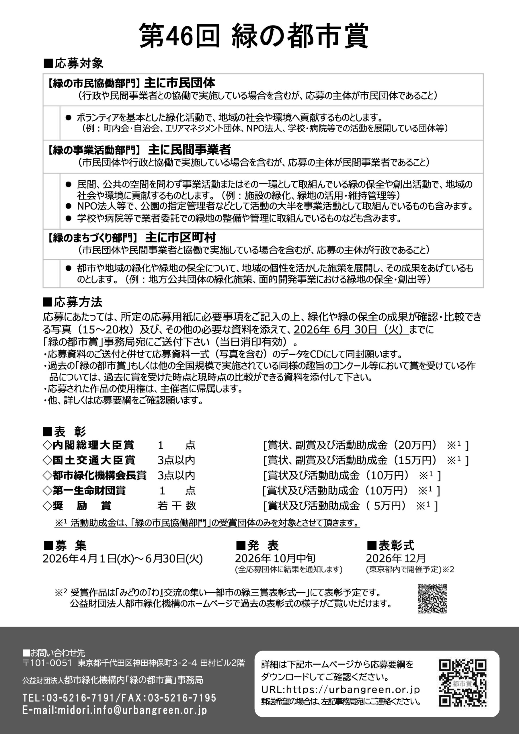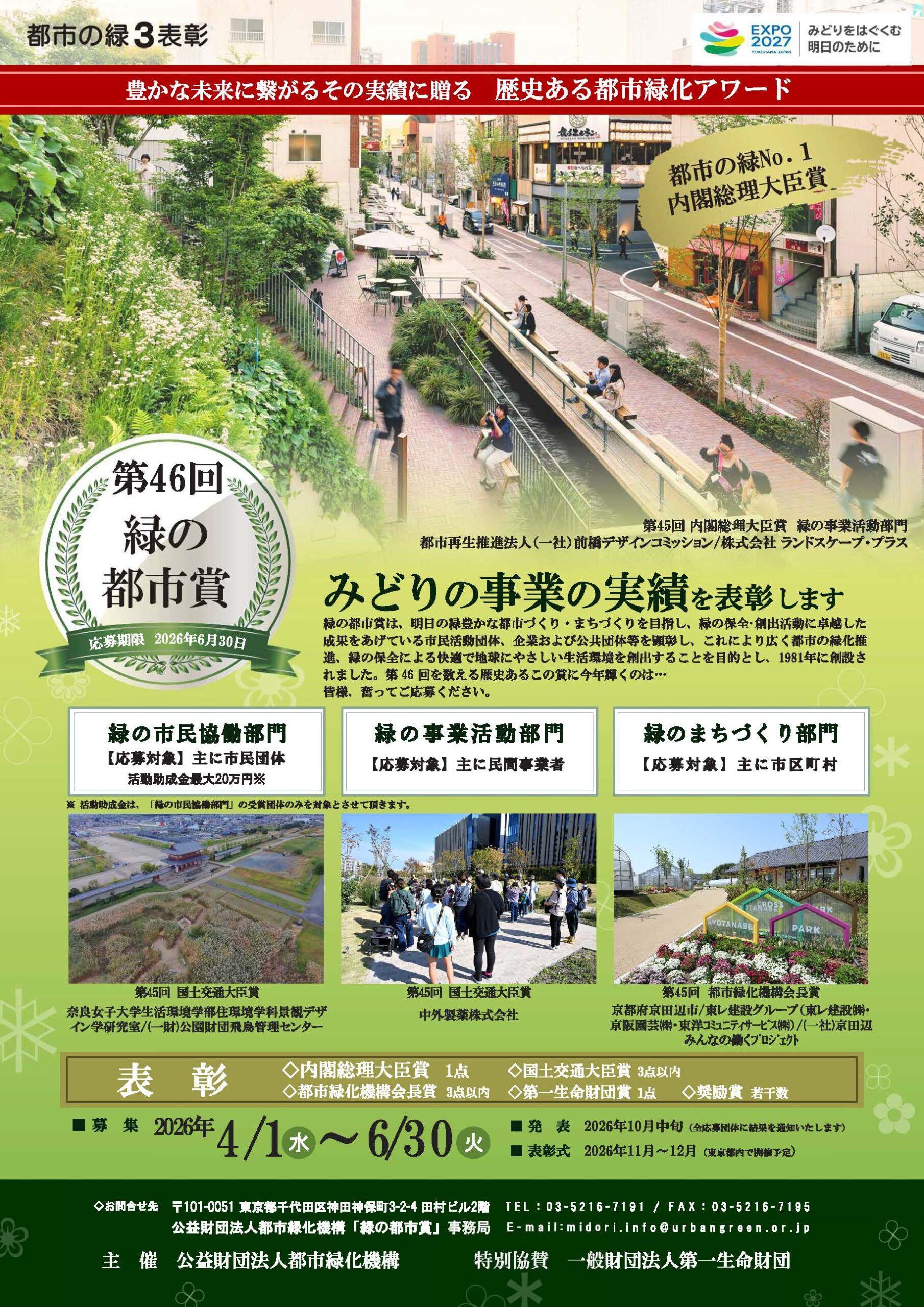 ・国土交通大臣賞・・・賞状・副賞、緑の市民協働部門については助成金15万円