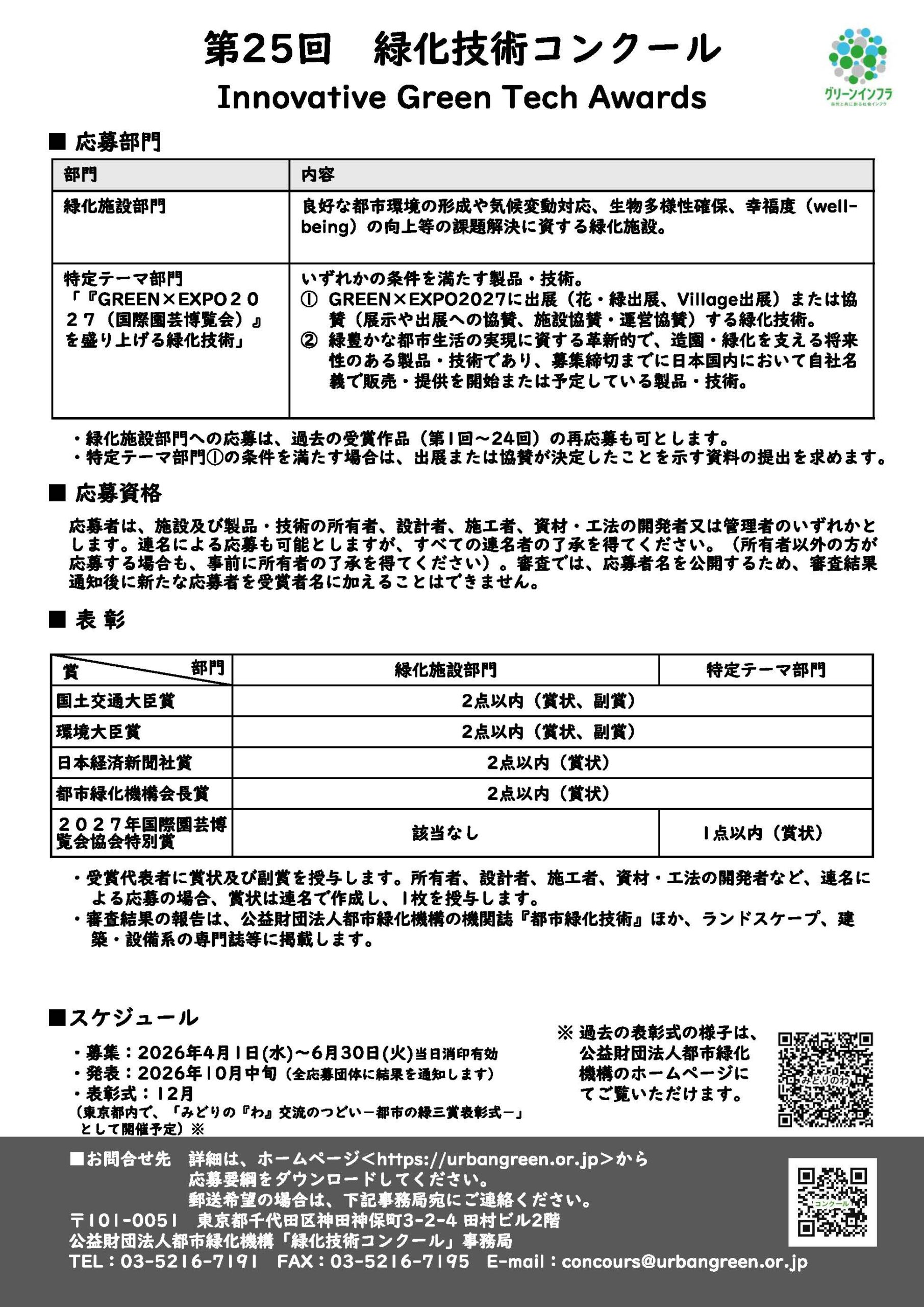 気候変動適応、2030年ネイチャーポジティブの実現、官民連携による居心地の良い空間づくりやにぎわい創出等の実現に資する緑化技術を広く募集します。
